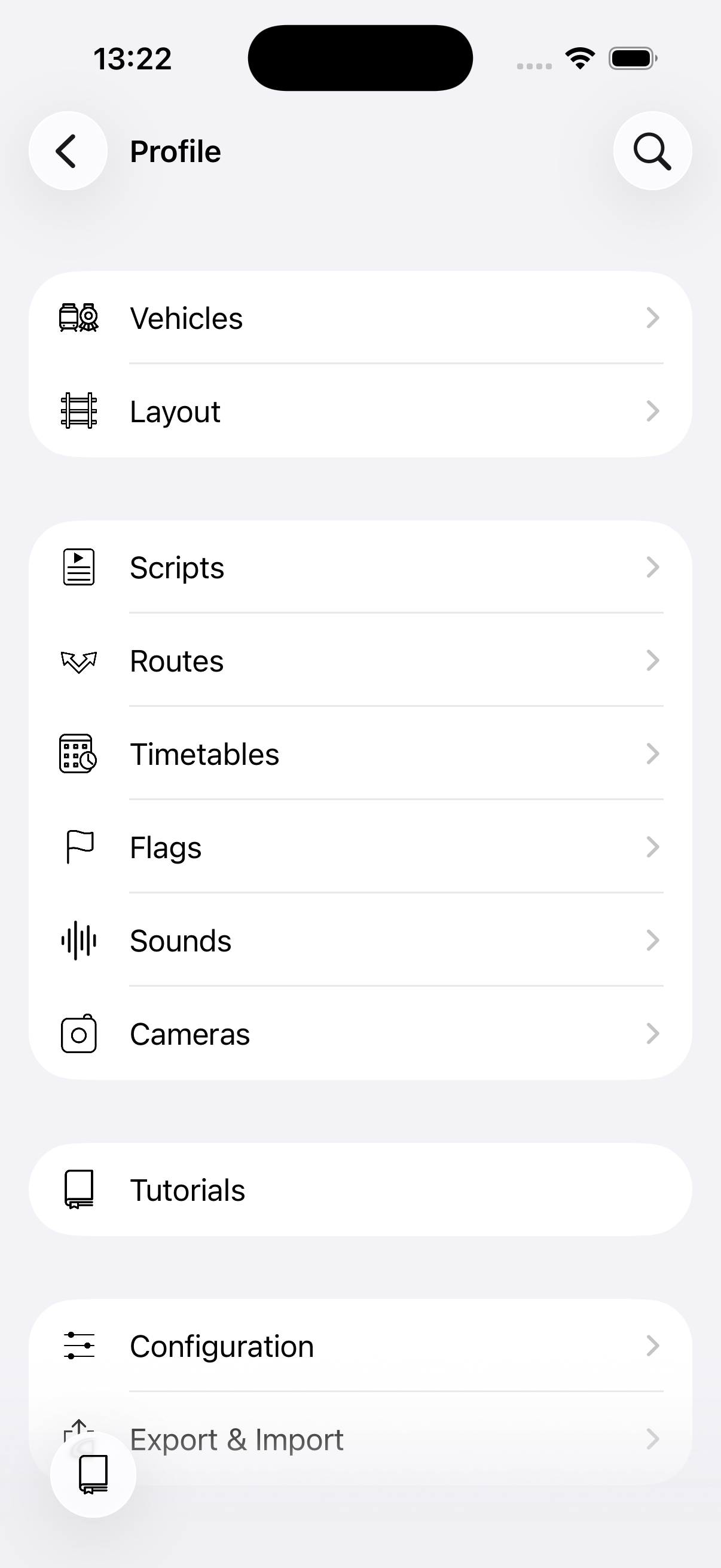 Profile können exportiert und mit anderen geteilt werden. So können Sie Freunden oder Vereinsmitgliedern Zugriff auf Ihre Anlagenkonfiguration geben — einschließlich aller Fahrzeuge, des Gleisplans und der Automatisierungsskripte.