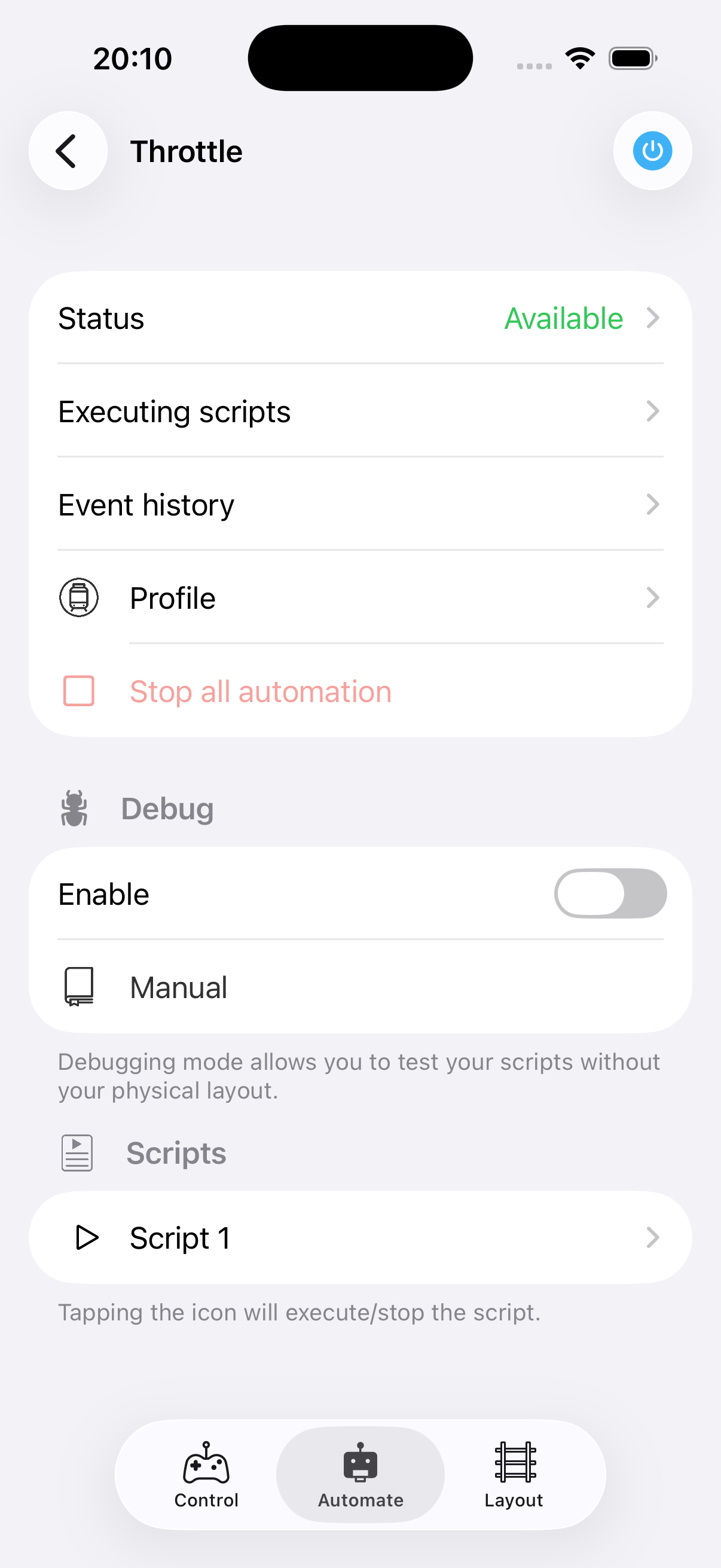 - Skripte — Starten oder stoppen Sie Skripte direkt aus der Steuerung.