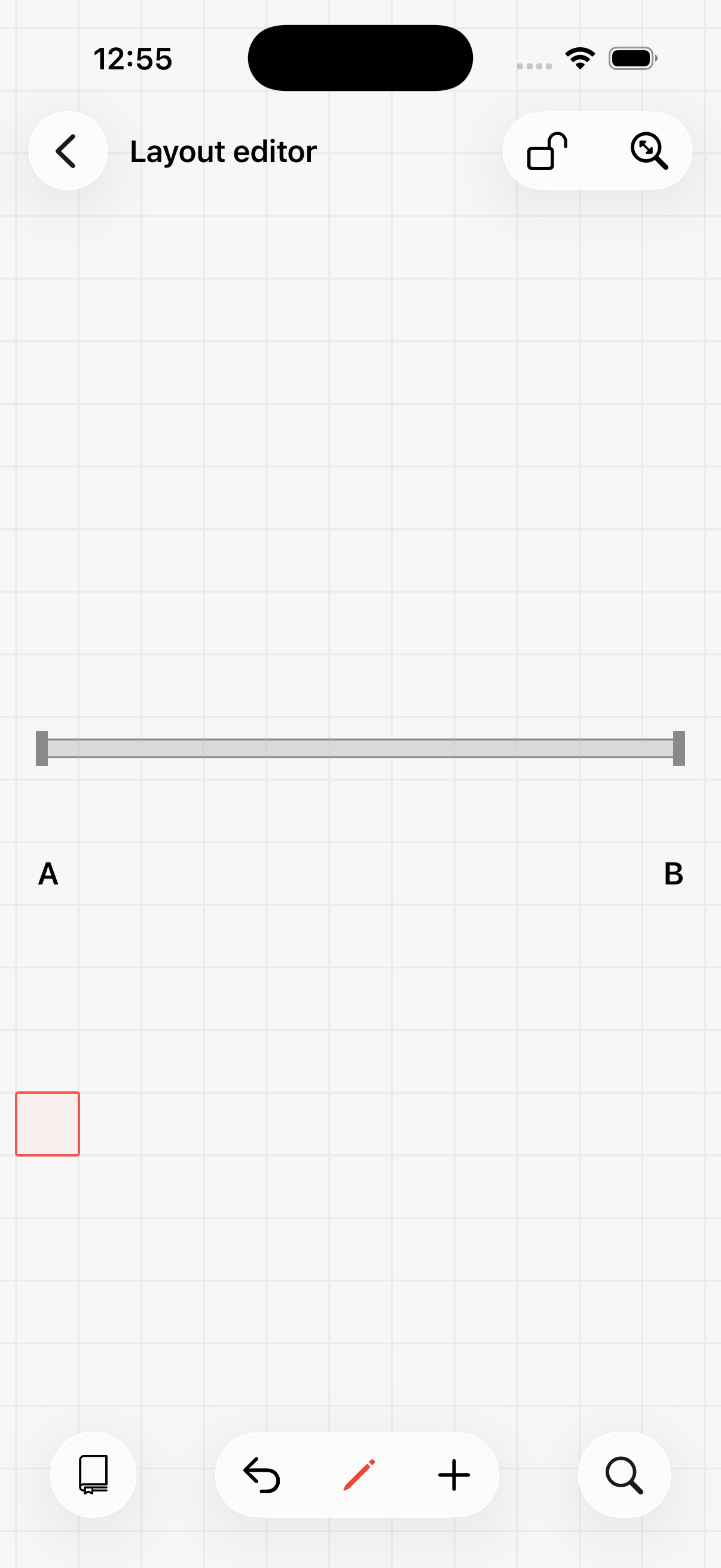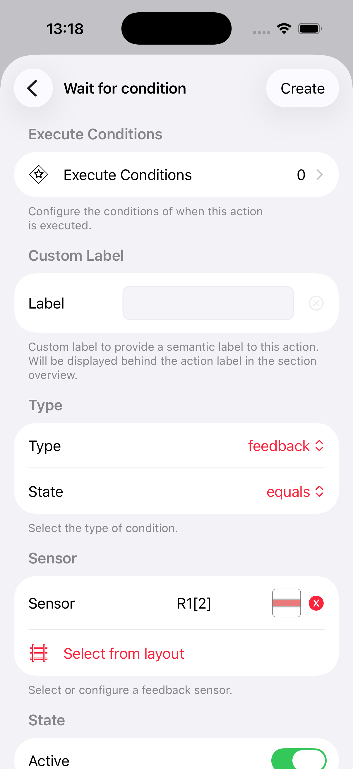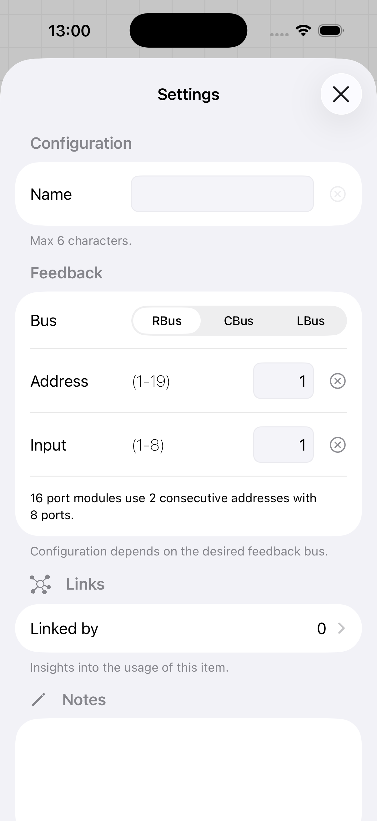 Select the pencil to enter edit mode, tap the track at position A, and open its configuration. Set the feedback to R-Bus module 1, port 1. For B, use module 1, port 2.