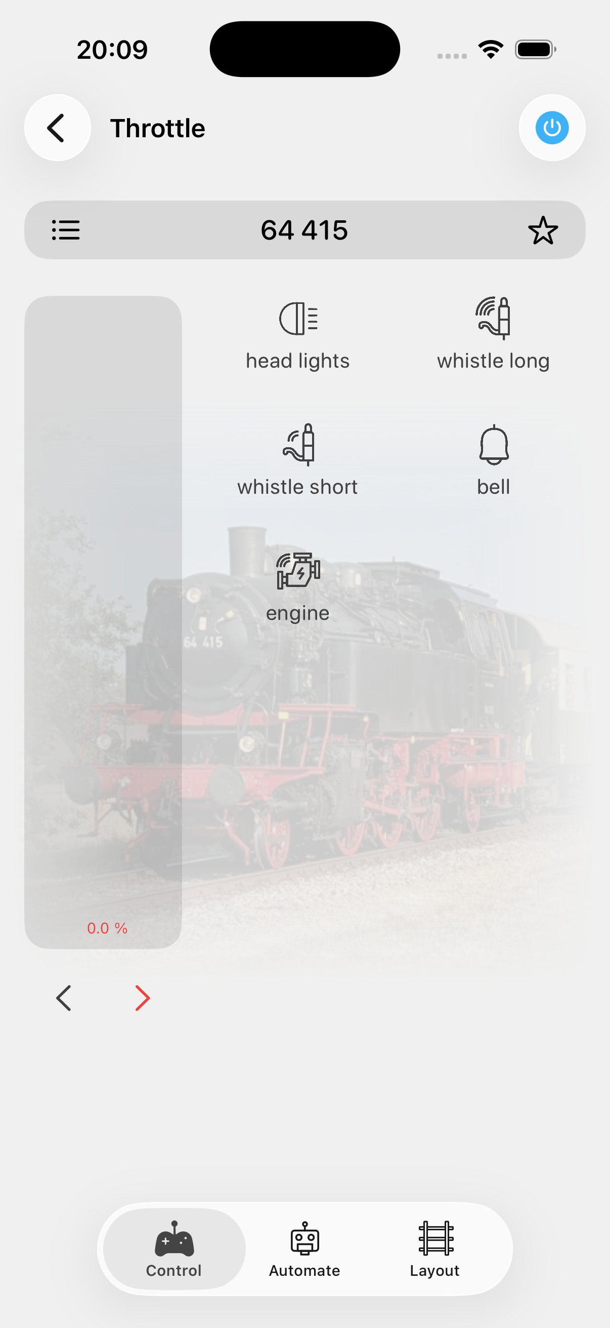 If your locomotive has speed profiles configured (idle, shunting, slow, medium, fast), tap the star icon to apply a preset with one tap. A profile sets speed, direction, and function states all at once.